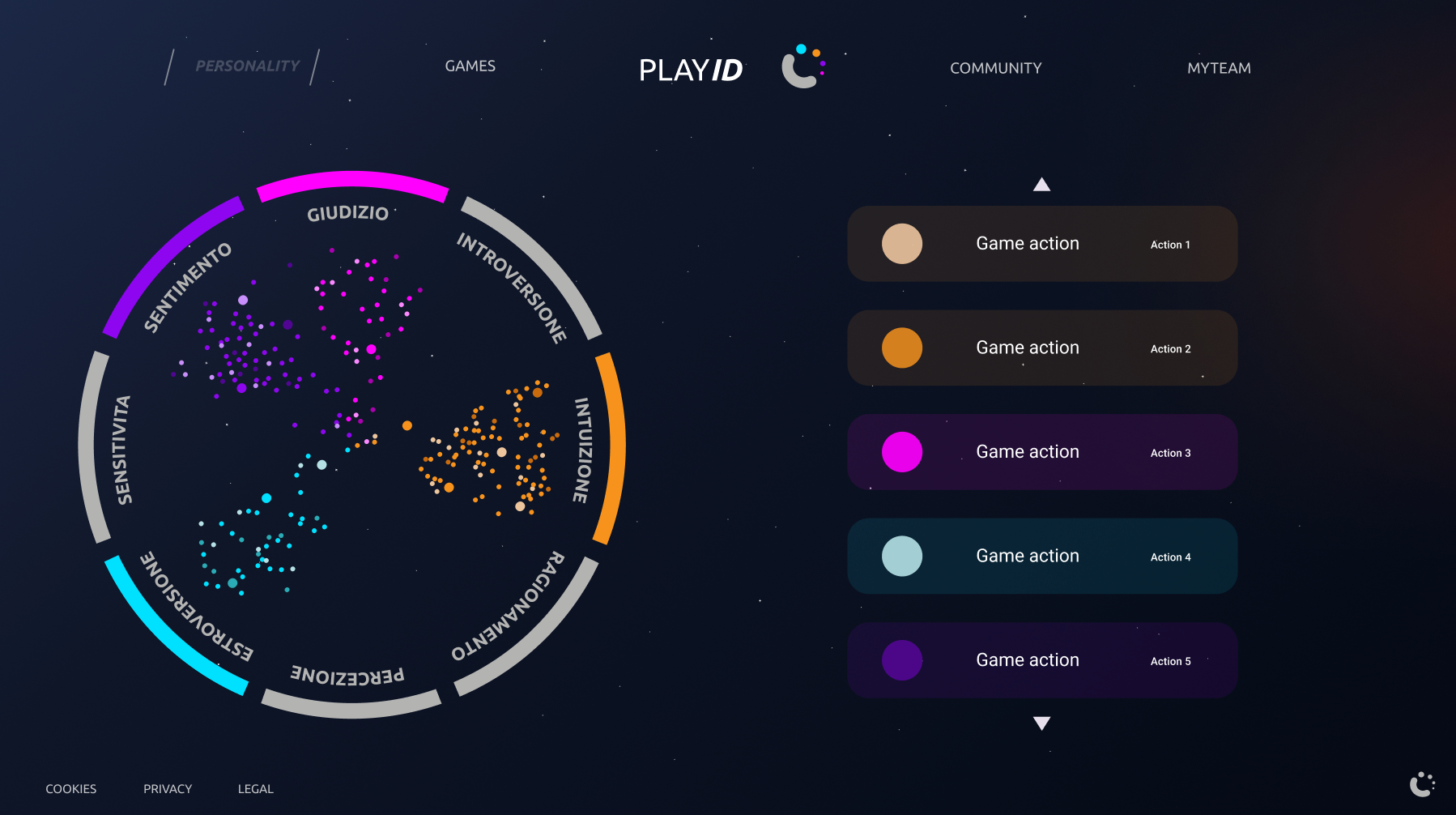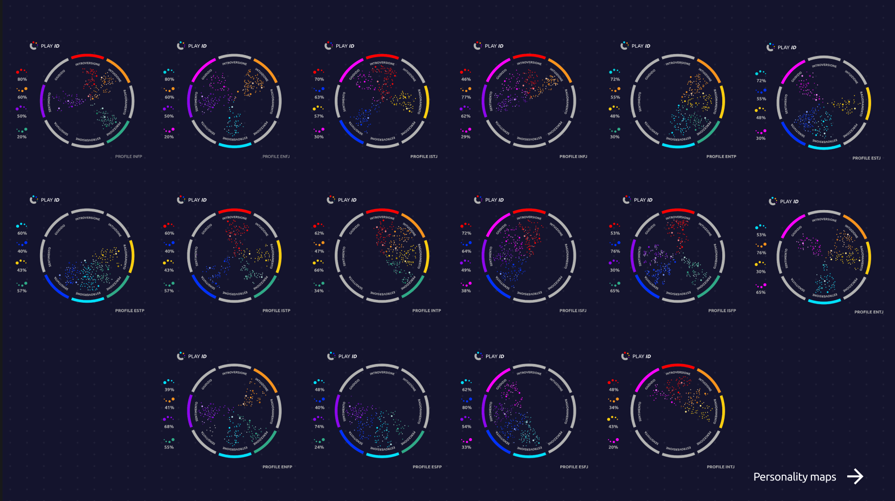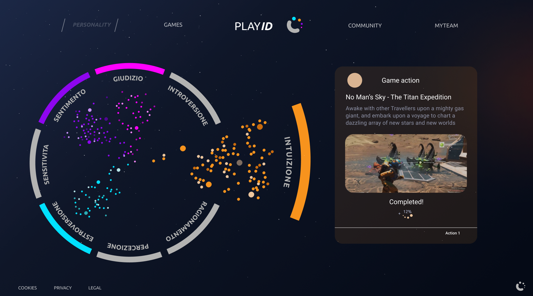 The distinctive element of PLAYID is the creation of interactive personal maps, unique to each player, which function as evolutionary pathways of the user’s personality. These maps, continuously updated, make it possible to visualize one’s gameplay journey as a reflection of personal attitudes, desires, and shortcomings. Through this graphical representation, players are able to better understand their own behavior and envision paths of growth, both individual and social.
